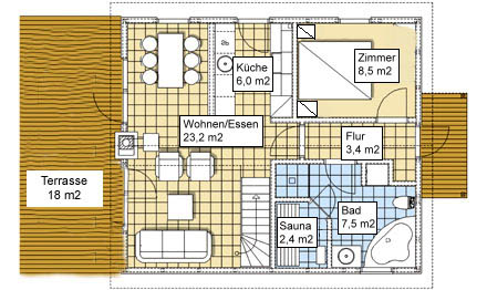 Im Erdgeschoss befindet sich der Wohnbereich mit einer Sitzgruppe, einer Essecke, einer vollständig eingerichteten Einbauküche sowie das Schlafzimmer mit einem Doppelbett.